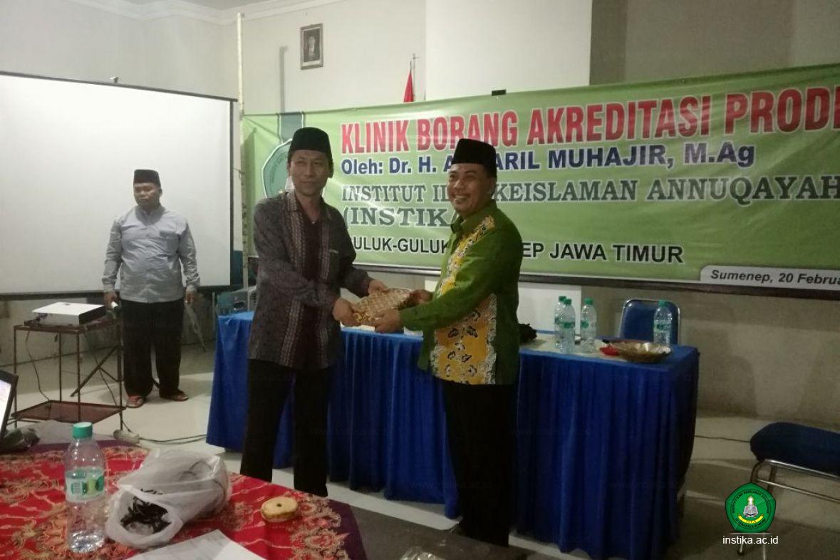 Kegiatan ini menghadirkan pemateri Dr H As’aril Muhajir M Ag selaku Asesor Badan Akreditasi Nasional Perguruan Tinggi (BAN-PT). Hadir mengikuti kegiatan ini, Rektor Instika Drs H Abbadi Ishomuddin MA, Wakil Rektor I Dr Ach Maimun M Ag, Wakil Rektor II H Mohammad Hosnan M Pd, Wakil Rektor III Drs H A Washil M Pd I, beserta seluruh Dekan, Kajur, dan Tim Penyusun Borang Prodi sekitar 25 orang.
