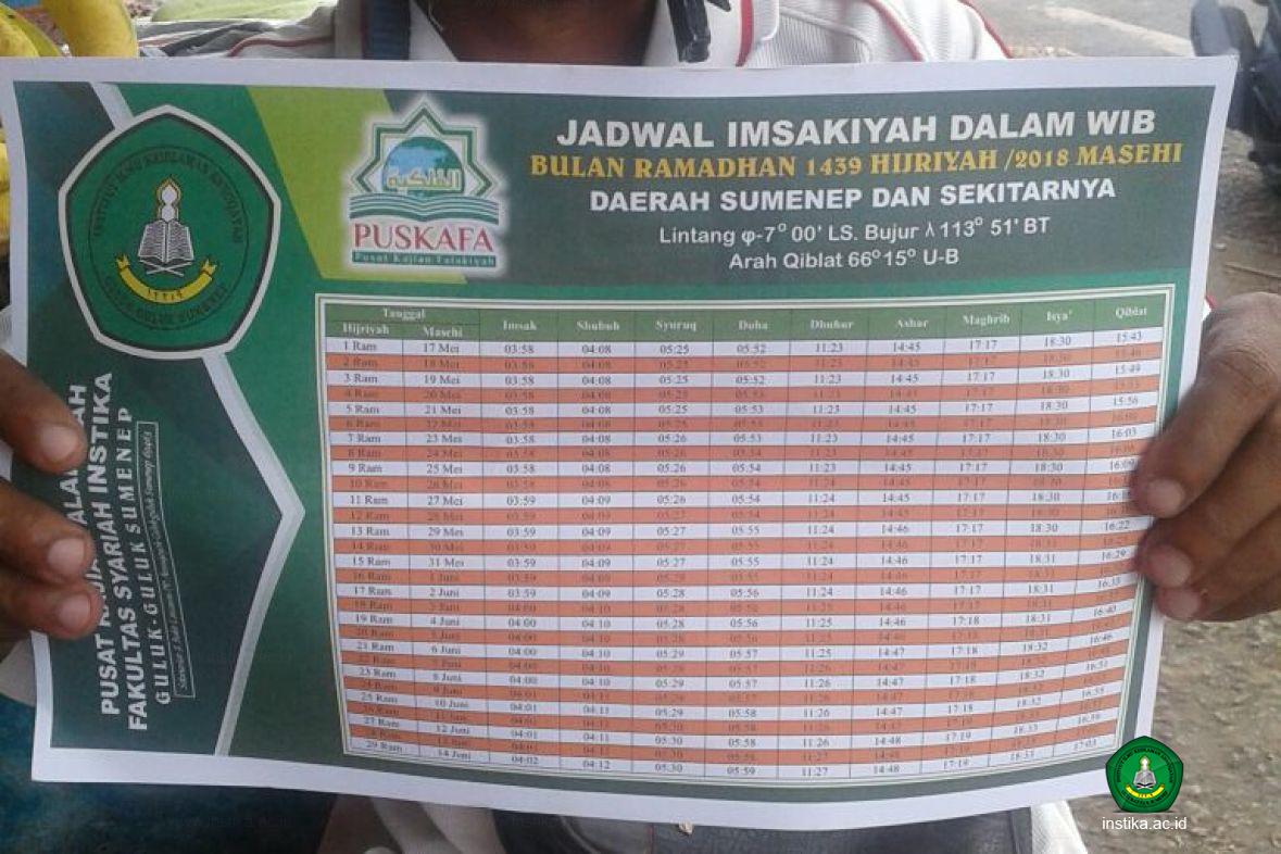 Sumenep - INSTIKA - Pusat Kajian Falakiyah (Puskafa) Fakultas Syariah Institut Ilmu Keislaman Annuqayah (INSTIKA) Guluk-Guluk Sumenep membagi-bagikan Jadwal Imsakiah dalam Waktu Indonesia Barat (WIB) khusus bulan Ramadan 1439 Hijriyah/2018 Masehi kepada warga Sumenep dan sekitarnya.