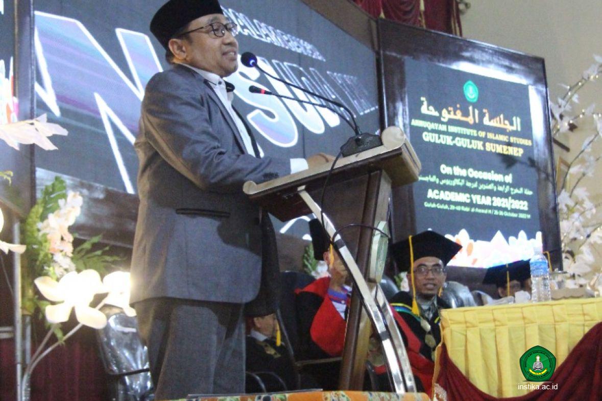Sekretaris Koordinator Kopertais IV ini kemudian bercerita tentang Ibnu Malik yang sangat mengangungkan gurunya dalam karyanya Alfiyah. Sebab, ia sadar, bahwa tanpa gurunya ia tidak mungkin bisa menjadi orang hebat. “Ini pelajaran yang sangat penting bagi kita, kita harus menghormati dan mendoakan guru-guru kita,” terangnya saat menyampaikan Orasi Ilmiah di hadapan wisudawati INSTIKA, Rabu (26/10/2022), di Aula Asysyarqawi.